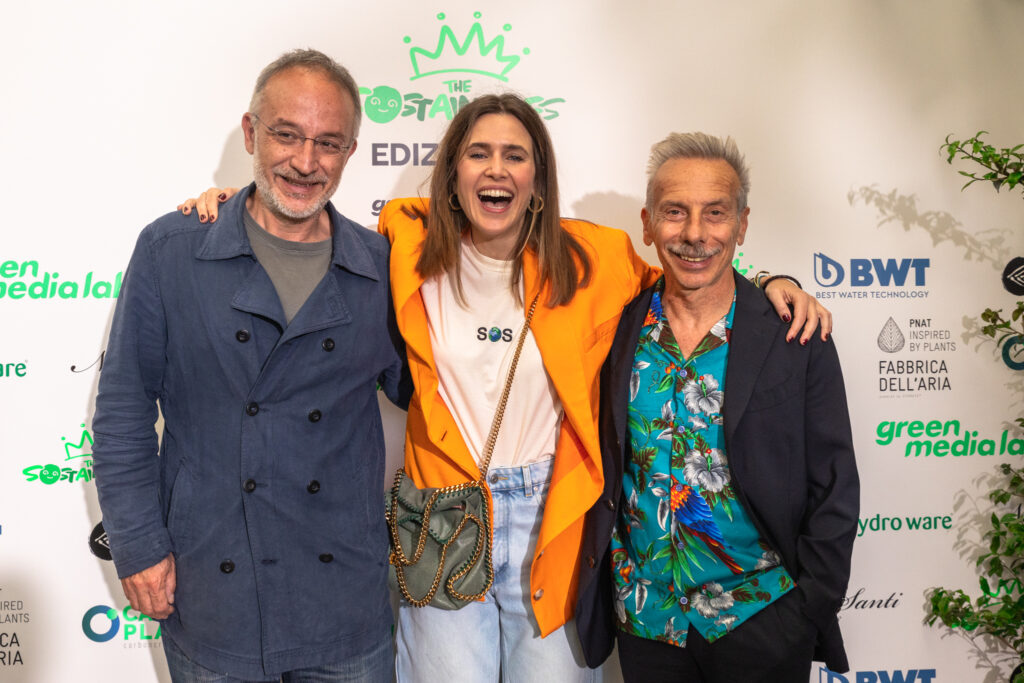 Il contest culminerà il prossimo 26 maggio 2026 presso l’Headquarter di Green Media Lab in Via Tertulliano 68, a Milano. La serata di premiazione sarà condotta dall’attrice e sustainability advocate Anna Favella (qui sotto in foto tra Stefano Mancuso e Giovanni Storti), che accompagnerà i giovani innovatori sul palco in un racconto dinamico capace di intrecciare visione imprenditoriale, creatività e impegno concreto.
