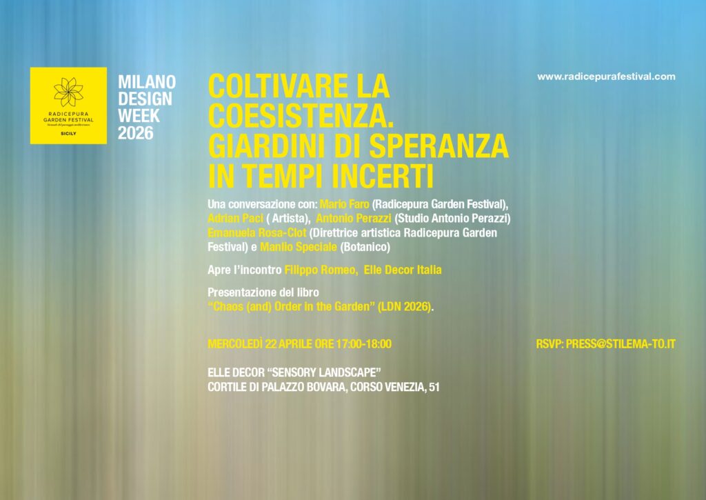 Il TEMA DELLA PROSSIMA EDIZIONE DEL RADICEPURA GARDEN FESTIVAL SARÁ PRESENTATO IN OCCASIONE DELLA MILANO DESIGN WEEK CON MARIO FARO, ADRIAN PACI, ANTONIO PERAZZI,
