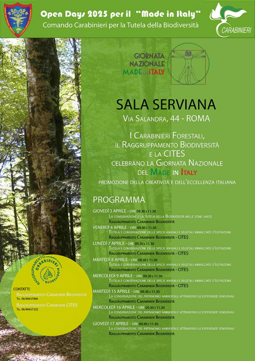 In occasione della 2^ edizione della Giornata del “Made in Italy” dedicata alla promozione della creatività e dell’eccellenza italiana, i Reparti Carabinieri Biodiversità hanno organizzato dal 3 al 17 aprile 2025 su tutto il territorio nazionale appositi “Open day” che consistono in giornate di educazione ambientale per veicolare i seguenti temi: