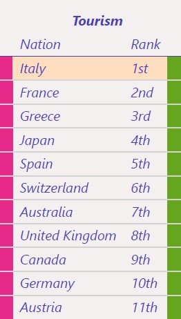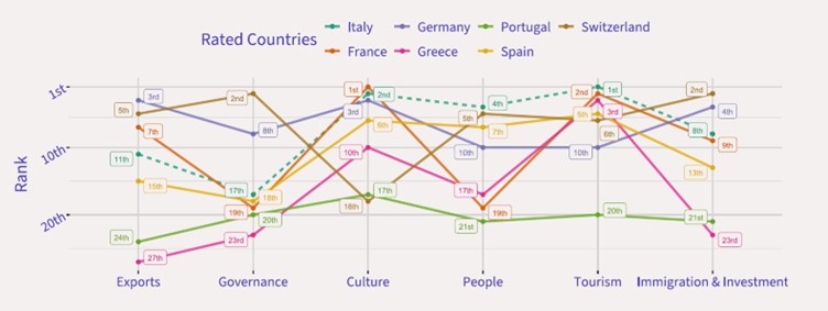 Dal 2008 al 2020 l’Italia oscillava tra il sesto e il settimo posto, ma dal 2021 ha scalato la classifica, raggiungendo il terzo posto una volta, il quarto tre volte e il quinto una volta. Un risultato che riflette un’ottima salute del “brand Italia”, anche se le variazioni dipendono anche dai movimenti di altri Paesi: il recente calo di “Brand America”, ad esempio, ha contribuito alla nostra ascesa.
