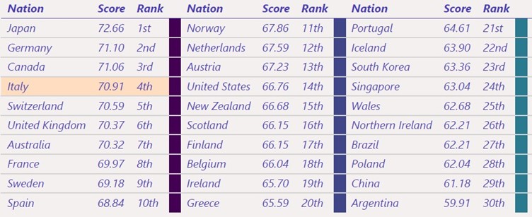 L’Italia continua a essere uno dei Paesi più ammirati al mondo. Lo conferma l’Anholt Nation Brands Index® (NBI), il sondaggio annuale che da vent’anni misura la percezione internazionale delle nazioni: oggi il nostro Paese vanta la quarta immagine più forte a livello globale, subito dopo Giappone, Germania e Canada, e davanti a Svizzera, Regno Unito e Australia.