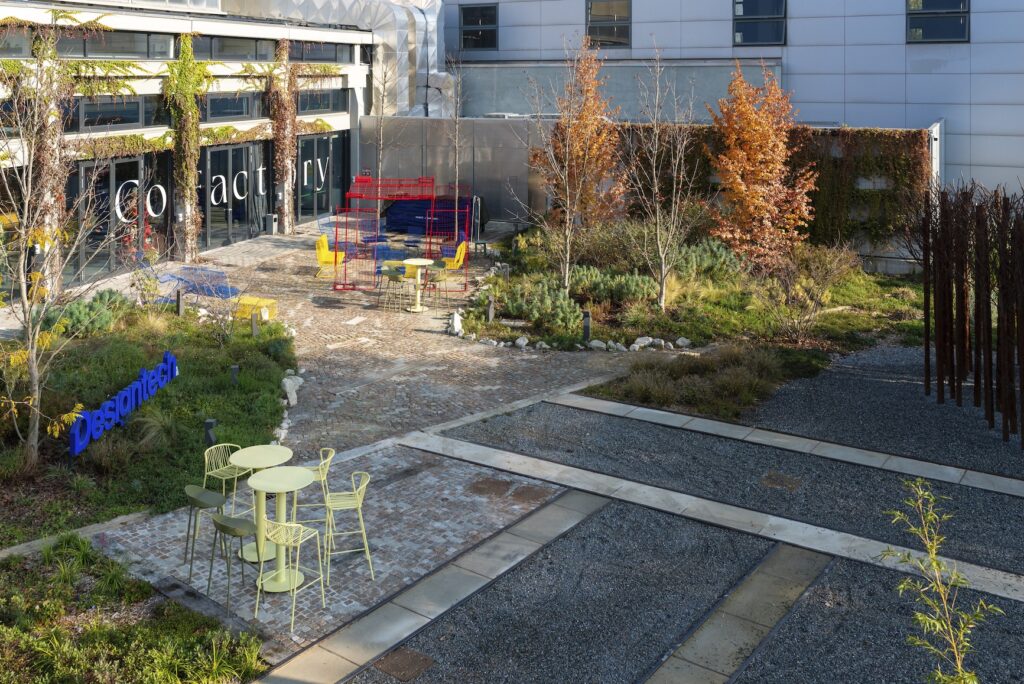 Il progetto, avviato nel maggio 2024 e completato nell’estate 2025, interessa un lotto di circa 1.600 m2, di cui 800 di nuove superfici verdi. Gli spazi aperti collegano tre edifici, Co-Factory, già attiva da un paio di anni, un club, il cui cantiere sta per terminare e un bistrot, in un edificio che sarà a breve ristrutturato. Si sta piano piano riconfigurando l’intera area e la nuova corte diventa estensione naturale e nuovo punto d’incontro per il quartiere.