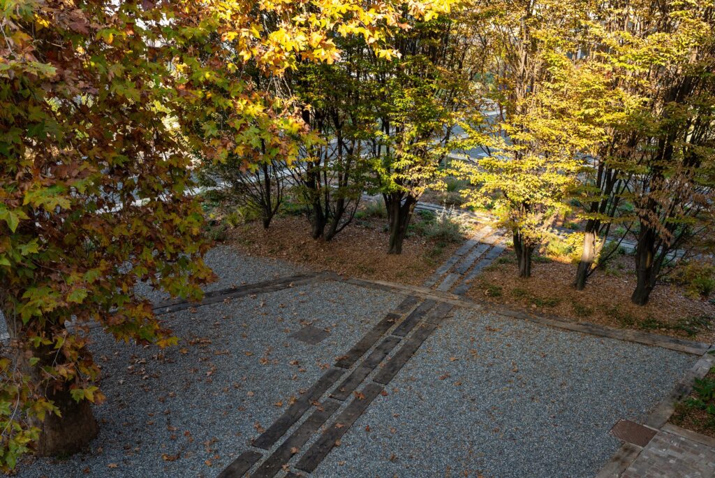 L’intervento ha infatti lavorato sulla depavimentazione e sul riuso dei materiali originari: cubetti di porfido e autobloccanti recuperati dal lotto adiacente, traversine ferroviarie rigenerate usate come cordoli e percorsi, superfici in ghiaia e acciaio che evocano la memoria industriale e operaia della zona. Il risultato è un paesaggio contemporaneo che unisce sostenibilità e memoria, con un linguaggio materico coerente e riconoscibile.
