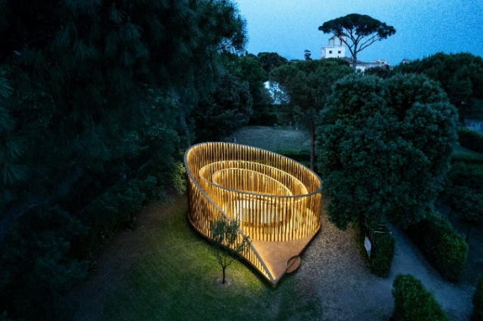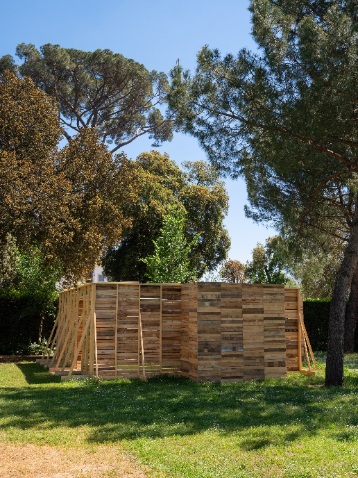 • Associates Architecture (Brescia, IT) ha concepito un recinto abitato che instaura un doppio dialogo con il panorama di Roma e con gli storici pini dei giardini di Villa Medici, moltiplicando punti di vista e giochi di osservazione. È presentata in risonanza con la mostra del Panorama di Louis Le Masson (1779).