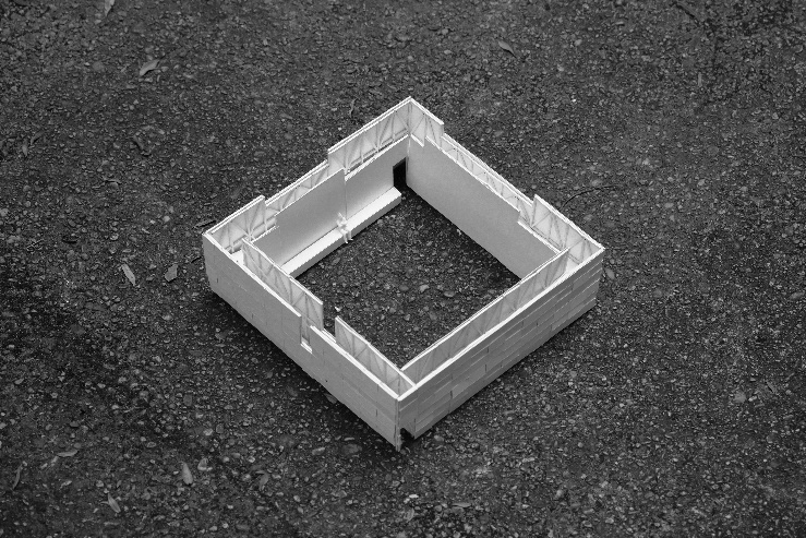 Gli architetti romani CAMPO e gli studenti internazionali del Diploma 20 dell’Architectural Association di Londra hanno progettato insieme un chiostro composto da un portico da cui si accede verso le principali funzioni di un monastero. Ispirato alle tradizioni arabe e romane, a loro volta eredità dei giardini persiani e babilonesi, il chiostro è uno spazio vuoto centrale che regola un insieme architettonico complesso, conciliando movimento e contemplazione, bisogni materiali e spirituali, al fine di scandire la vita in comunità dei monaci. A differenza di un’architettura-oggetto destinata alla contemplazione, la capanna Chiostro si distingue per la struttura esterna modulare, che sottolinea il suo radicamento in un processo di auto-costruzione. All’interno, la purezza della forma è enfatizzata da un rivestimento continuo, realizzato con scarti di legno. Lo spazio vuoto centrale conduce a quattro piccole stanze chiuse, luoghi ideali per lo scambio, ma anche per isolarsi dal mondo.