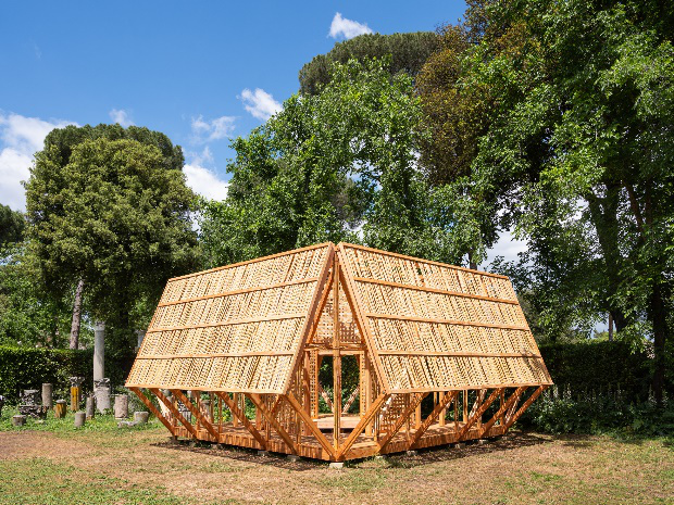 Concepito come una struttura al tempo stesso leggera e monumentale, il padiglione esplora l’ibridazione tra paesaggio industriale e gesto artigianale. Elemento centrale del padiglione, l’ossatura metallica dalla forma inclinata evoca la silhouette delle architetture vernacolari giapponesi ed è rivestita da oltre 4000 mattoni alveolari fabbricati nel Lazio, legati uno a uno con corde argentate che seguono il versante del tetto, creando giochi di luce e ombra. A terra, un’ampia piattaforma rettangolare è pensata per accogliere performance, letture ed eventi, e stabilisce un legame con il dispositivo della libreria all’ingresso di Villa Medici. Il padiglione si configura così come un “tetto abitato”, una pelle porosa e vibrante dove si afferma una forma di essenzialità: materiali grezzi, assemblaggi reversibili, economia di mezzi e serialità.