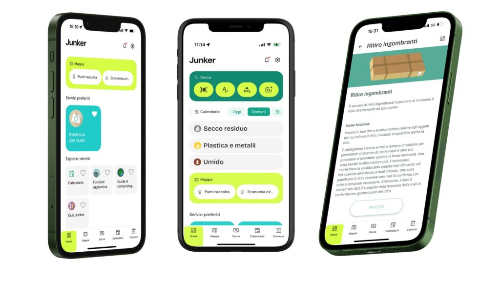 La nuova identità visiva riflette un’evoluzione così profonda da trasformare la mission dell’app. Nata come “tutor” smart per accompagnare gli italiani verso una raccolta differenziata più spinta e accurata, Junker è diventata negli anni uno strumento per promuovere l’empowerment dei cittadini in tema di circolarità e facilitare le loro interazioni con il Comune o l’azienda di gestione ambientale. Questo aspetto è stato ulteriormente potenziato nella nuova app, prestando grande attenzione all’usabilità da parte degli utenti, compresi quelli con ridotte capacità visive, non nativi digitali o stranieri.