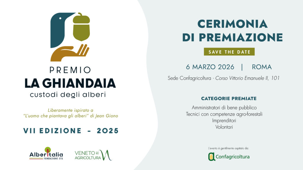 Piantare un albero è un atto di fede nel futuro, ma curarlo fino a renderlo bosco è un atto di responsabilità. Con questo spirito, Fondazione AlberItalia ETS e Veneto Agricoltura annunciano la cerimonia conclusiva della settima edizione del Premio “La Ghiandaia – Custodi degli Alberi”, che si terrà il prossimo 6 marzo 2026 nella prestigiosa cornice di Palazzo della Valle, sede di Confagricoltura a Roma.