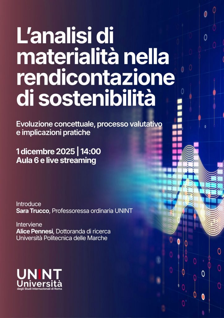 L’Università degli Studi Internazionali di Roma organizza l’evento dal titolo “L’analisi di materialità nella rendicontazione di sostenibilità: evoluzione concettuale, processo valutativo e implicazioni pratiche” che si terrà lunedì 1 dicembre 2025 a partire dalle ore 14:00 in aula 6 e in live streaming.