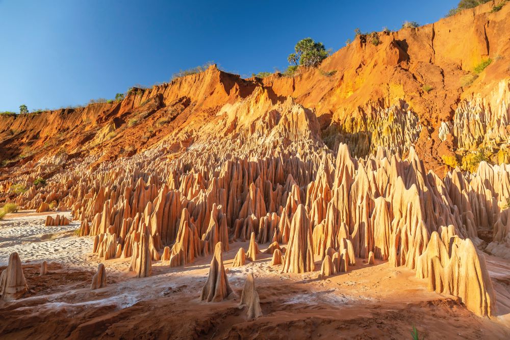 Il mare, di un turchese ostinato che non finisce mai. La costa, quasi cinquemila chilometri di paesaggi dai contrasti decisi. L’entroterra, con foreste pluviali, cattedrali carsiche di tsingy e parchi naturali mentre un respiro di spezie soffia verso distese di sabbia e di canyon plasmati dal vento. È il Madagascar, uno dei maggiori hotspot di biodiversità al mondo