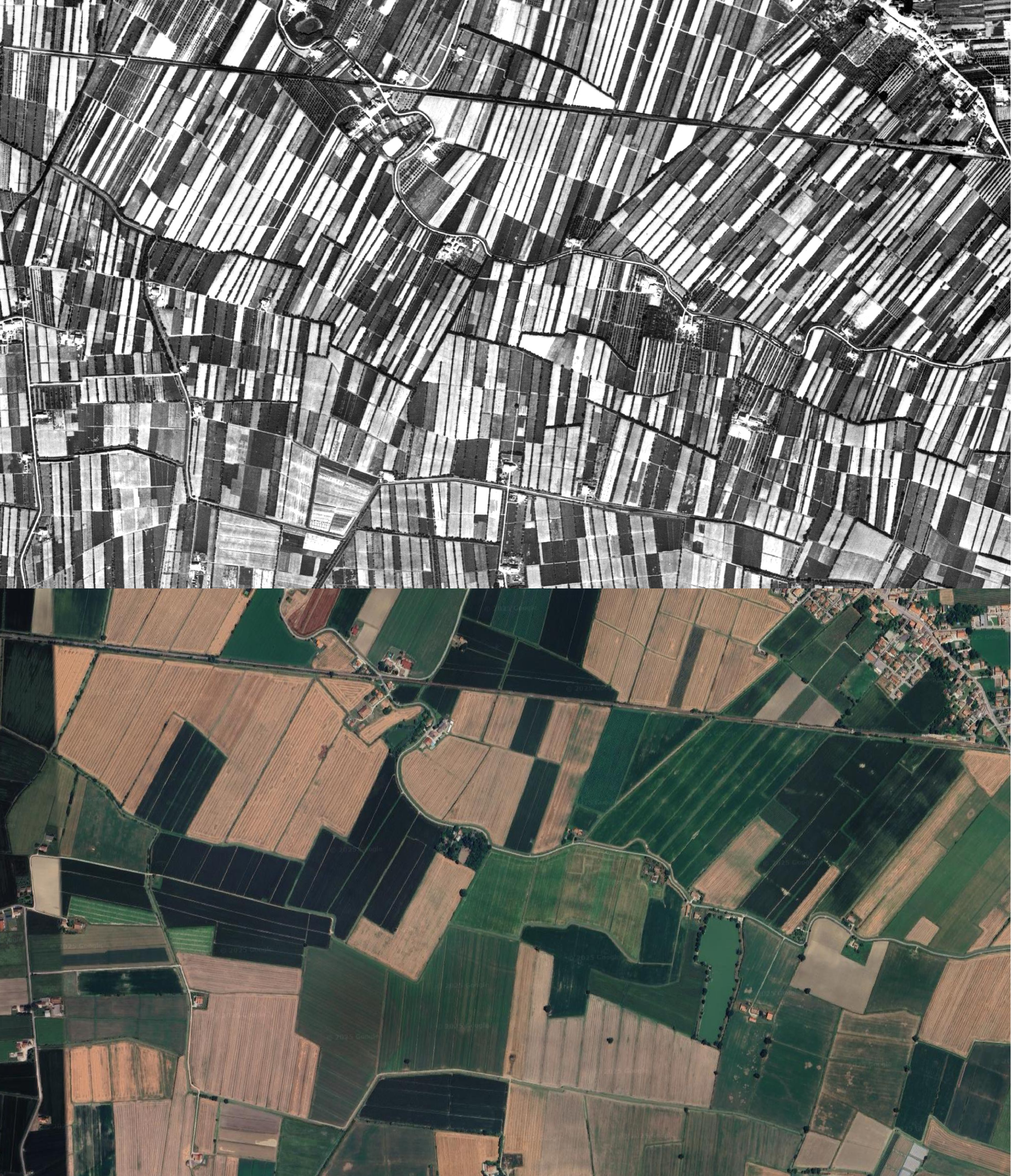 Nell’immagine di copertina un esempio della trasformazione radicale avvenuta in Pianura Padana negli ultimi 70 anni. In alto, situazione nel 1954, paesaggio rurale dominato da sistemi agroforestrali. La parte in basso, situazione attuale (immagine satellitare del 2024) che mostra la quasi totale scomparsa di Coltura Promiscua, sostituita da monocolture intensive.